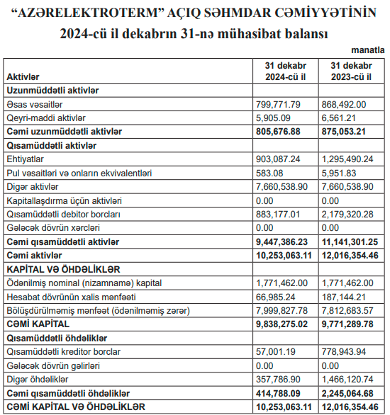 "Azərelektroterm" Açıq Səhmdar Cəmiyyəti 2024-cü ilin yekunlarına dair maliyyə hesabatını açıqlayıb.