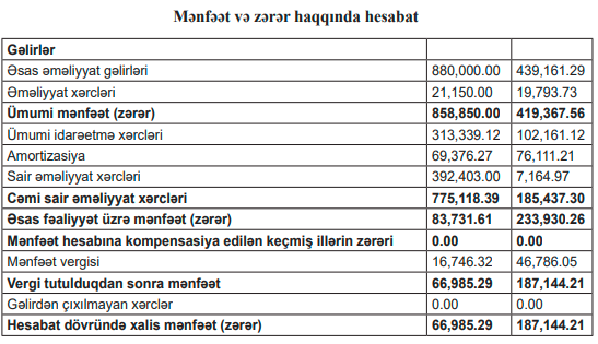 Ümumi mənfəət (zərər) 858,9 min manata bərabər olub. İllik 439,5 min manat artım və ya təxminən 2 dəfə artım baş verib.