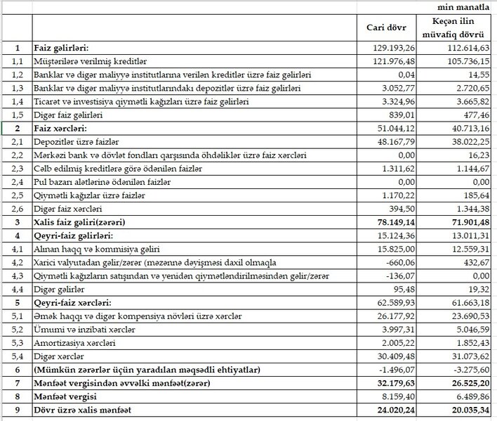 Bankın qeyri-faiz gəlirləri 15 milyon 124 min manat səviyyəsində olub, ötən ilin 13 milyon 11 min manatı ilə müqayisədə 16,2% artım göstərib. Qeyri-faiz xərcləri isə 62 milyon 590 min manat olub ki, bu da 2024-cü ilin 61 milyon 663 min manatı ilə müqayisədə 1,5% artım deməkdir.