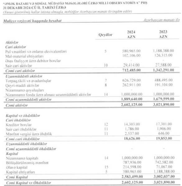 Hesabat ilində "Əmək Bazarı və Sosial Müdafiə Məsələləri üzrə Milli Observatoriya" PHŞ-nin cəmi kapitalı 2 milyon 583,5 min manat təşkil edib. Bu, illik 418,5 min manat (13,9%) azalmadır.