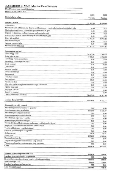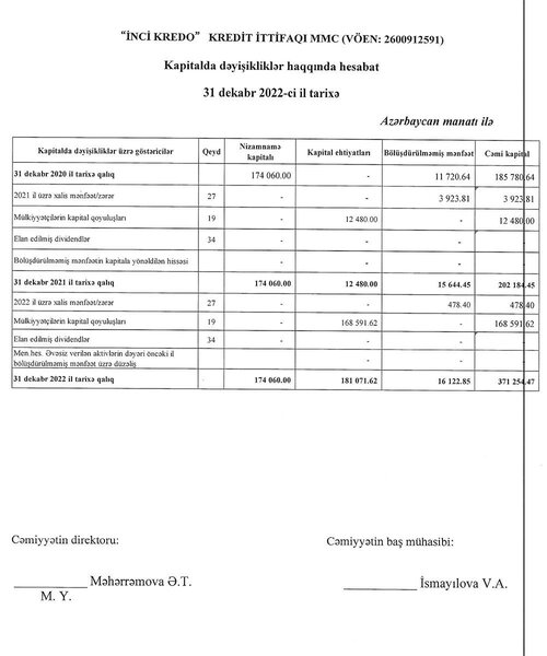 "İnci Kredo" Kredit İttifaqı MMC-nin 31 Dekabr 2022-ci il tarixində bitən il üzrə maliyyə hesabatları açıqlanıb.