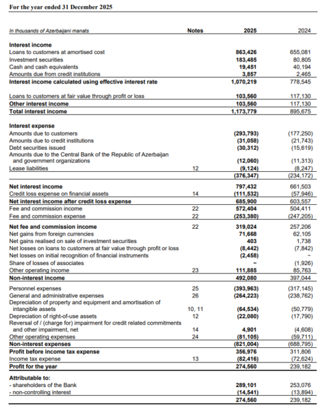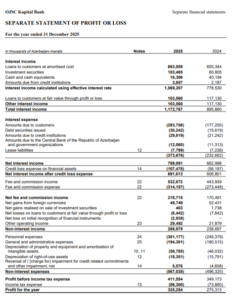 "Kapital Bank" ASC-nin 31 dekabr 2025-ci il tarixində başa çatan il üzrə ayrıca maliyyə hesabatlarına görə, Bank 2025-ci ili 325 milyon 254 min manat xalis mənfəət ilə başa vururb. Bu, 2024-cü illə çüqayisədə 49 milyon 941 min manat və ya 18,1% çoxdur. Bank 2024-cü ili 275 milyon 313 min manat xalis mənfəət ilə bağlamışdı.