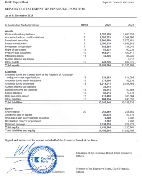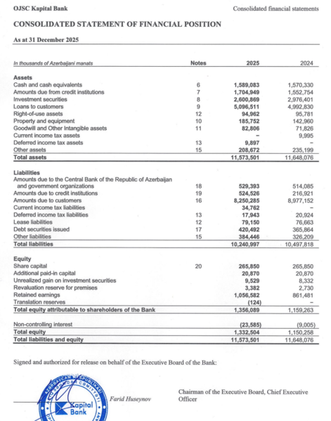 "Kapital Bank" ASC 31 dekabr 2025-ci il tarixində başa çatan il üzrə Konsolidə edilmiş maliyyə hesabatlarını dərc edib. Hesabatlar Maliyyə Hesabatlarının Beynəlxalq Standartları (MHBS) əsasında hazırlanıb.