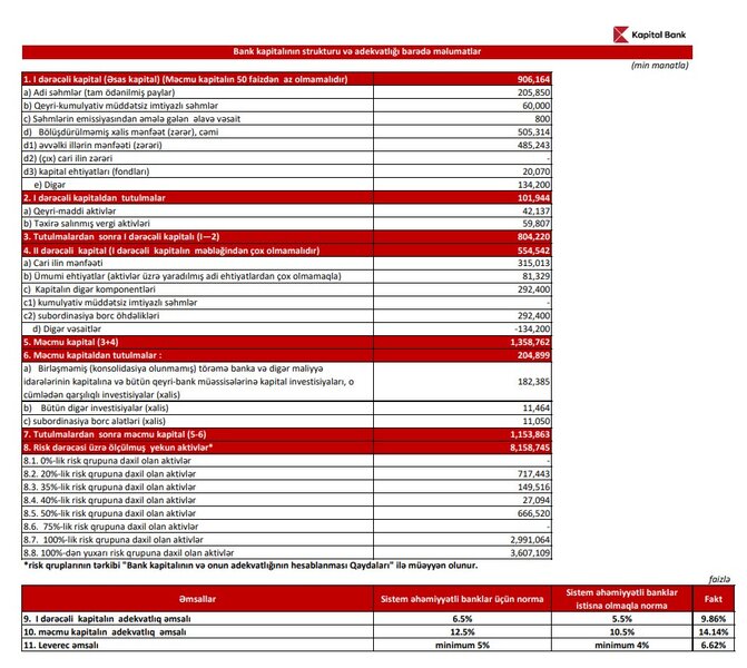 2025-ci ilin sonuna bankın məcmu kapitalı 1 milyard 153 milyon 863 min manat olub. 2024-cü illə müqayisədə kapital 177 milyon 236 min manat və ya 18,1% artıb. Bu artım Kapital Bankın maliyyə dayanıqlığının və tənzimləyici kapital ehtiyatlarının gücləndiyini göstərir.