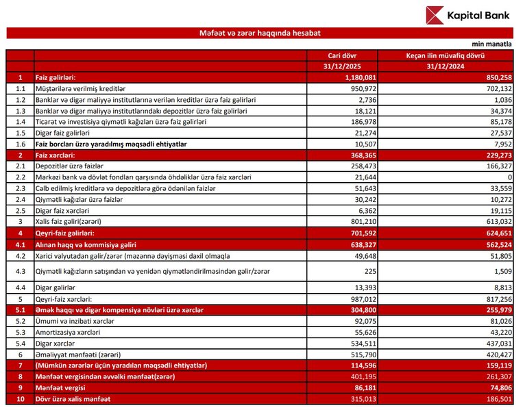 "Kapital Bank" ASC 2025-ci ili 315 milyon 13 min manat xalis mənfəət ilə başa vurub. Bank 2024-cü ili 186 milyon 501 min manat xalis mənfəət ilə bağlamışdı. Beləliklə, "Kapital Bank"ın xalis mənfəəti 2025-ci ildə 2024-cü illə müqayisədə 128 milyon 512 min manat və ya 68,9% artıb.
