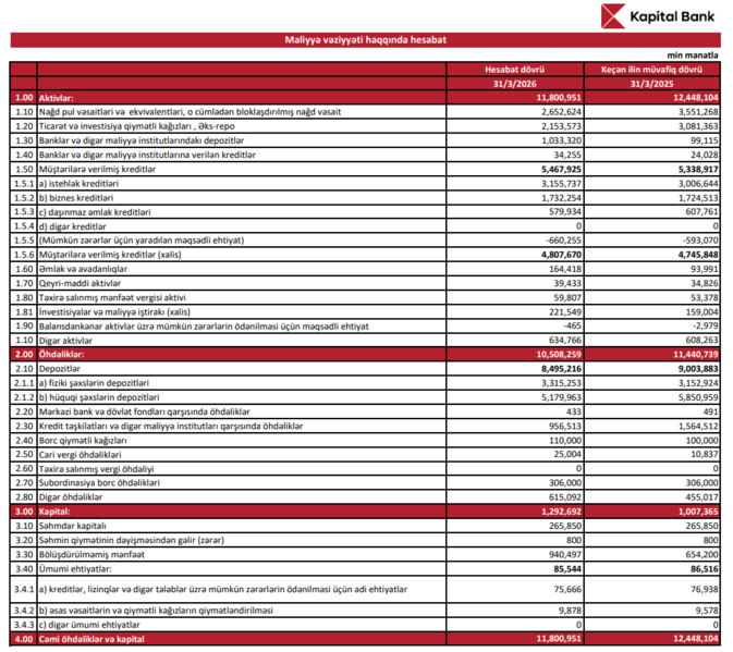 2026-cı ilin 31 mart tarixinə "Kapital Bank"ın cəmi aktivləri 11 milyard 800 milyon 951 min manat təşkil edib. 2025-ci ilin sonunda isə aktivlər 12 milyard 448 milyon 104 min manat idi. Beləliklə, aktivlər 647 milyon 153 min manat və ya 5,2 % azalıb.