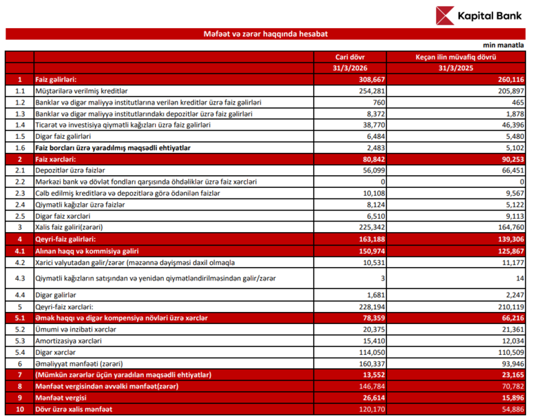 2026-cı ilin ilk rübündə "Kapital Bank"ın əməliyyat mənfəəti 160 milyon 337 min manat təşkil edib. 2025-ci ilin eyni dövründə isə bu göstərici 93 milyon 946 min manat idi. Beləliklə, əməliyyat mənfəəti 66 milyon 391 min manat və ya 70,7 % artıb.