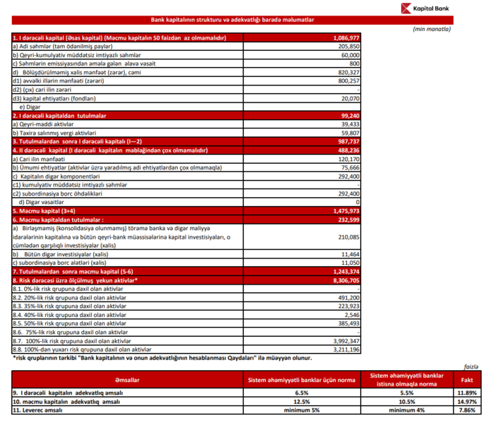 31 mart 2026-cı il tarixinə "Kapital Bank"ın məcmu kapitalı 1 milyard 243 milyon 374 min manat təşkil edib. 2025-ci ilin sonunda isə kapital 1 milyard 153 milyon 863 min manat idi. Beləliklə, kapital 89 milyon 511 min manat və ya 7,8 % artıb.