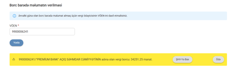 Məlumata əsasən, "Premium Bank" ASC-nin vergi borcu 34 251.25 manatdır. Bu vergi borcu 22.04.2026-cı il tarixinə olan məlumatdır.