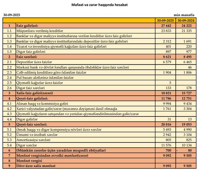 "Premium Bank" ASC 2025-ci ilin 9 ayı üzrə (yanvar-sentyabr) maliyyə nəticələrini açıqlayıb.
