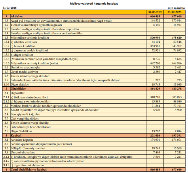 Bank 2025-ci ilin ilk rübünü 1 milyon 582 min manat xalis mənfəət ilə bağlamışdı.