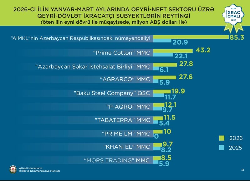 2026-cı ilin ilk rübündə pambıq istehsalçısı "Prime Cotton" MMC-nin ixracının cəmi dəyəri 43,2 milyon ABŞ dolları təşkil edib.