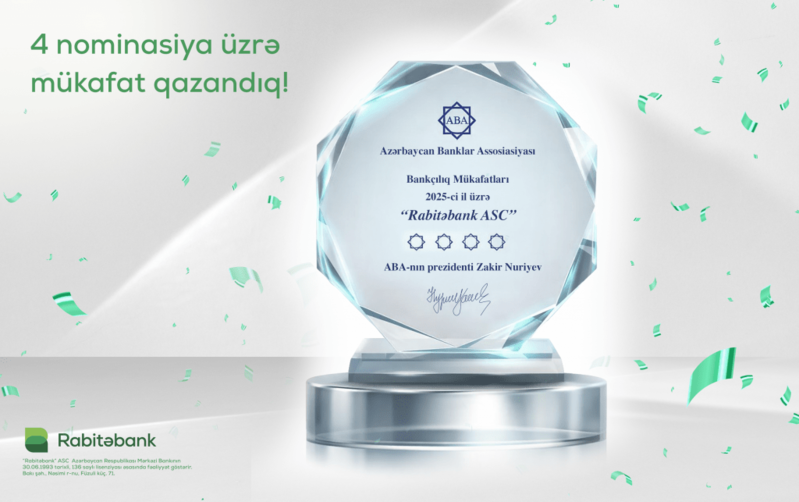 ®Rabitəbank Azərbaycan Banklar Assosiasiyası (ABA) tərəfindən təşkil olunan "Bankçılıq Mükafatları – 2025" tədbiri çərçivəsində 4 mühüm nominasiya üzrə mükafata layiq görülüb. Bankın il ərzində həyata keçirdiyi çoxşaxəli fəaliyyətlər, innovativ yanaşmaları və sosial məsuliyyət təşəbbüsləri nüfuzlu mükafatlarla yüksək qiymətləndirilib.