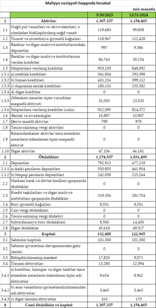 "Rabitəbank" ASC-nin 2025-ci ilin 30 sentyabr tarixinə maliyyə vəziyyəti haqqında hesabatına əsasən, bankın aktivləri ilin əvvəlindən 13.2% artaraq 1 milyard 307.3 milyon manata yüksəlib. Halbuki, 2024-cü ilin sonuna — 1 milyard 154.5 milyon manat olmuşdu.