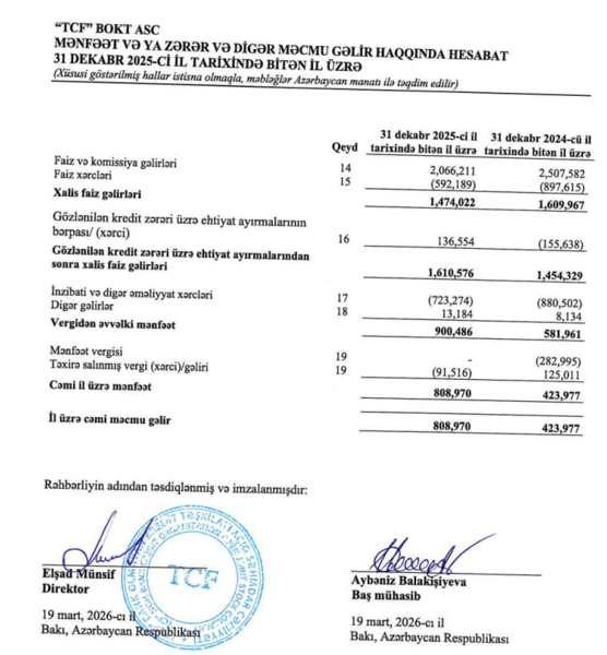 "TCF" BOKT ASC 2025-ci ili 808 min 970 manat xalis mənfəət ilə başa vurub. Kredit təşkilatı 2024-cü ili 423 min 977 manat xalis mənfəət ilə bağlamışdı. Beləliklə, ötən il "TFC" BOKT-ın xalis mənfəəti 384 min 993 manat və ya 90,8% artıb.