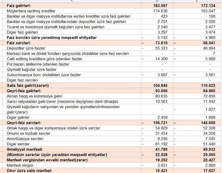 Lakin faiz xərcləri daha sürətli templə artıb – 73 milyon 609 min manata çatıb, yəni ötən ilin eyni dövrünə (56 milyon 541 min manat) nisbətən 17 milyon 68 min manat və ya 30,2% artıb. Bu, depozit faizlərinin artması, eləcə də maliyyə resurslarının dəyərinin yüksəlməsi ilə bağlıdır.