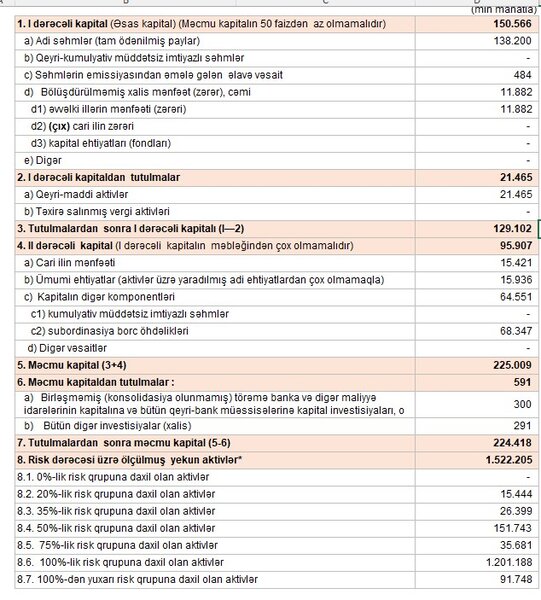 2025-ci ilin 30 sentyabr tarixinə bankın məcmu kapitalı 224 milyon 417 min manat olub. Bu, 2024-cü ilin sonundakı 176 milyon 897 min manatdan 47 milyon 520 min manat və ya 26,8% artım deməkdir.