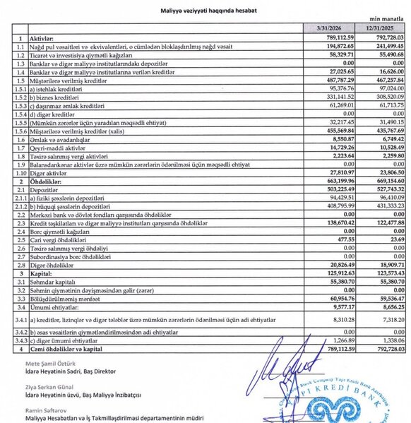 2026-cı ilin ilk rübünün sonuna bankın depozit portfeli 503 milyon 225 min manat təşkil edib. Bu göstərici 2025-ci ilin sonu ilə müqayisədə 24 milyon 518 min manat və ya 4,6 % azdır. 2025-ci ilin sonunda depozit portfeli 527 milyon 743 min manat idi.