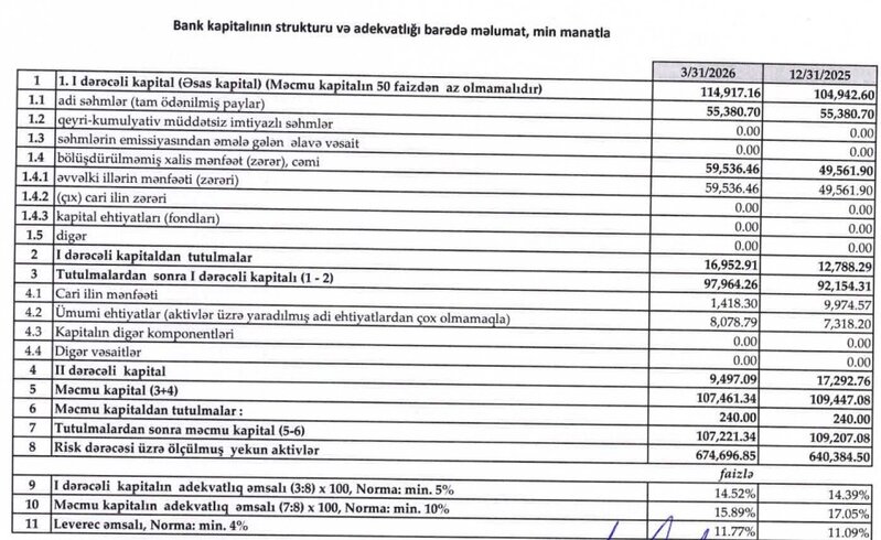 Hesabat dövrünün sonunda bankın kredit portfeli 487 milyon 787 min manat olub. Bu göstərici 2025-ci ilin sonu ilə müqayisədə 20 milyon 529 min manat və ya 4,4 % artım deməkdir. Ötən ilin sonunda kredit portfeli 467 milyon 258 min manat təşkil edirdi.