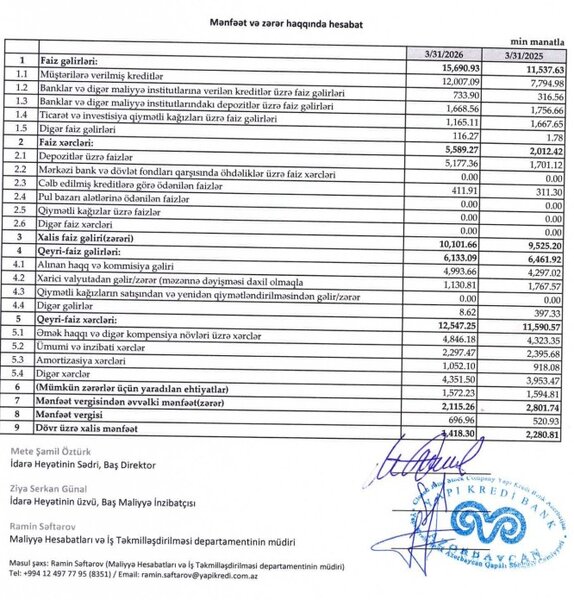 "Yapı Kredi Bank Azərbaycan" QSC 2026-cı ilin ilk rübü üzrə (yanvar - mart) maliyyə nəticələrini açıqlayıb. Hesabata əsasən, bankın mənfəəti azalsa da, kredit portfeli və kapital mövqeyi artım nümayiş etdirib.