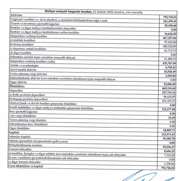 2025-ci ilin sonuna bankın cəmi aktivləri 792 milyon 728 min manata çatıb. Bu, illik müqayisədə 62 milyon 366 min manat və ya 8,5% artım deməkdir.