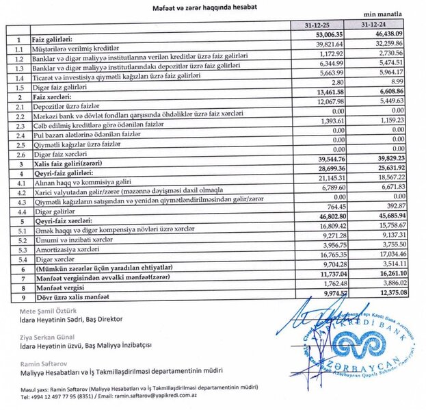 2025-ci ildə "Yapı Kredi Bank Azərbaycan"ın faiz gəlirləri 53 milyon 6 min manata yüksəlib. Bu, 2024-cü illə müqayisədə 6 milyon 568 min manat və ya 14,1% artım deməkdir.