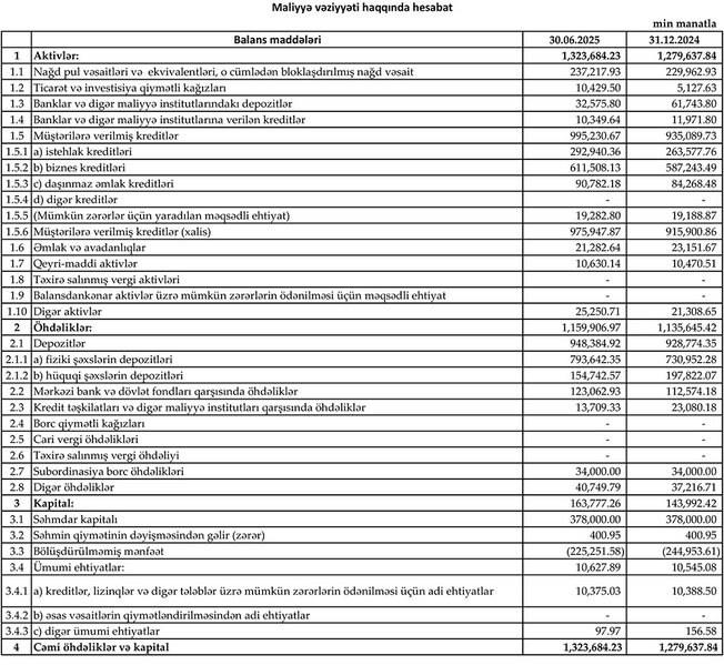 2024-cü ilin sonu ilə müqayisədə 2025-ci ilin 1-ci yarısında "Yelo Bank"da depozitlər 19 milyon 610 min manat və ya 2,1% artaraq 948 milyon 384 min manata çatıb.